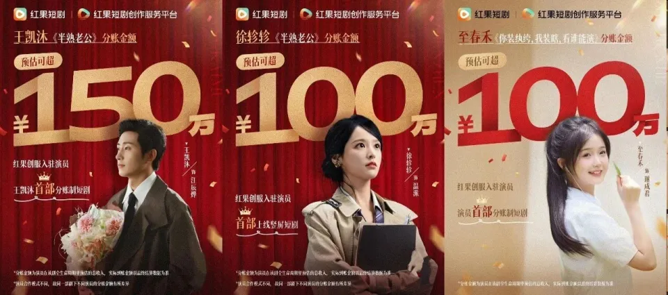 红果今年对行业的重大影响之二,是分账机制。2025年8月,红果短剧升级剧本合作政策,评级最高的保底稿费从12万元上升至20万元,分成从20%升至40%。9月4日,红果推出了“演员合作计划”,瞄准了短剧产业链的演员经纪业务。在红果创作者大会上,红果自制剧升级为短剧创作服务平台,开放编剧入驻。11月20日首次公开数据显示,王凯沐、徐轸轸、至春禾三位演员获得了百万+分账。2025年10月平台总分账突破7300万。